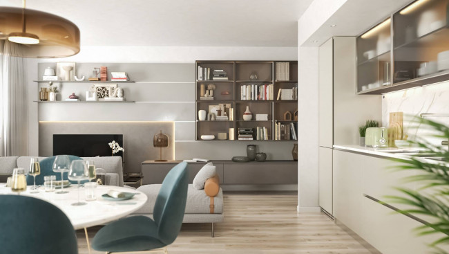 Presenta una zona living con spazi luminosi e ben definiti per collocare una cucina a vista con comodo tavolo + zona tv con salotto e creare un ambiente caloroso e di rappresentanza.
